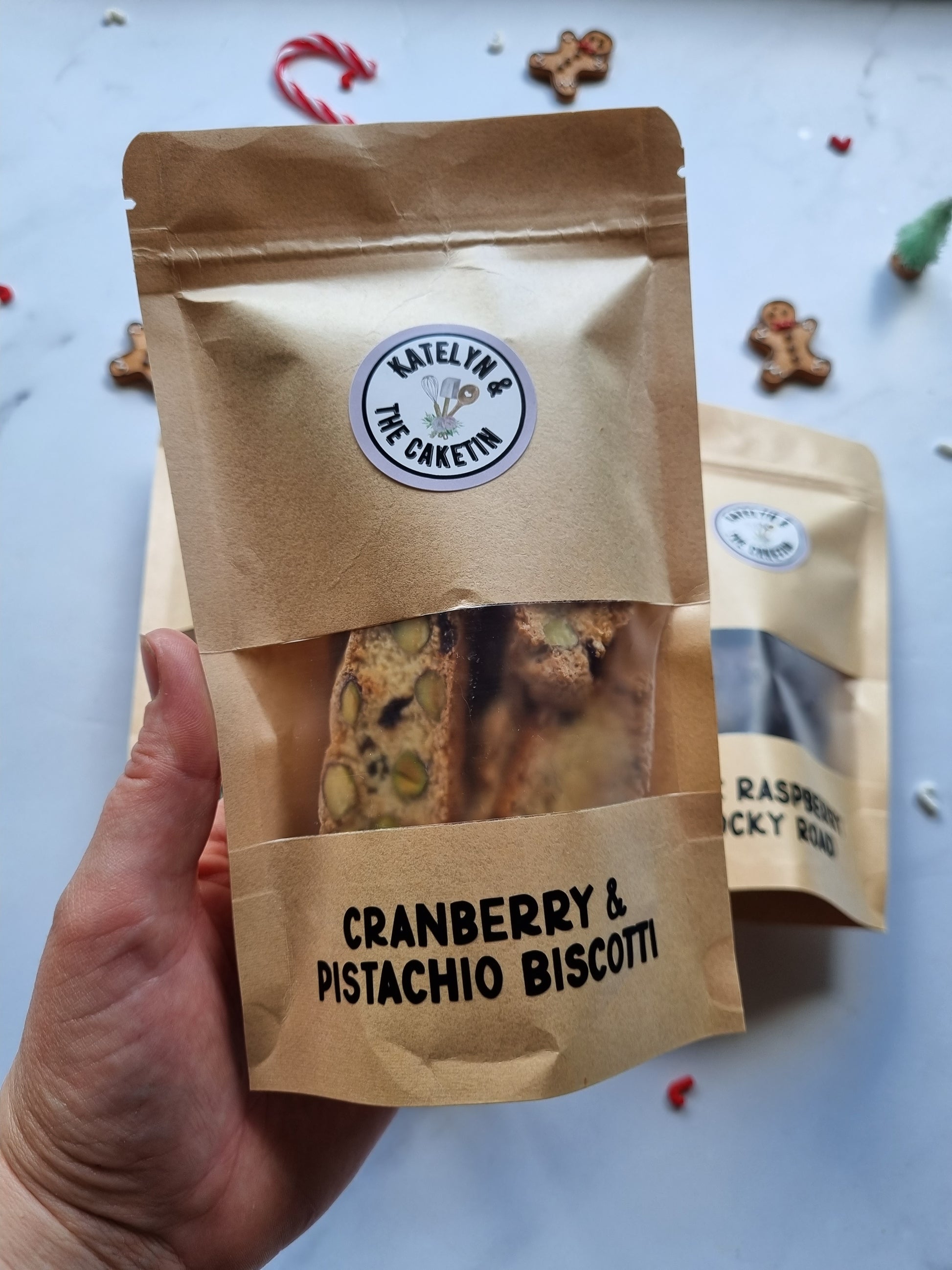 Cranberry and pistachio biscotti - Delicious twice baked biscotti loaded with cranberries & pistachios. Approx 100g. Contains WHEAT, GLUTEN, EGGS, NUTS.